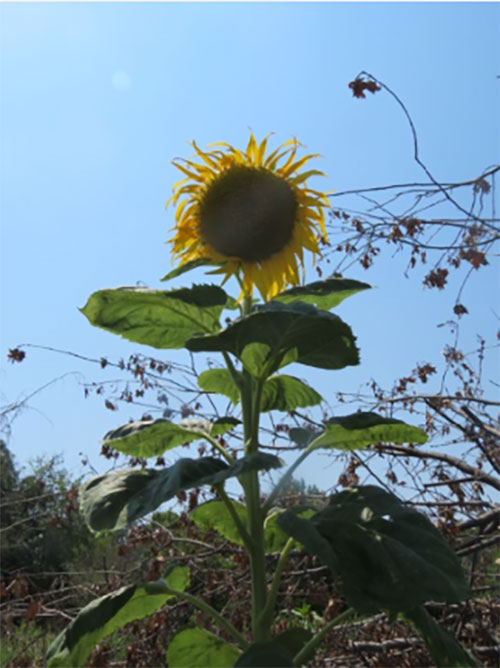 Upon further approach to the burn pile, we noticed something that was indeed amazing. Out of ashes, a huge, beautiful, and most magnificent sunflower somehow sprung out of the ground.