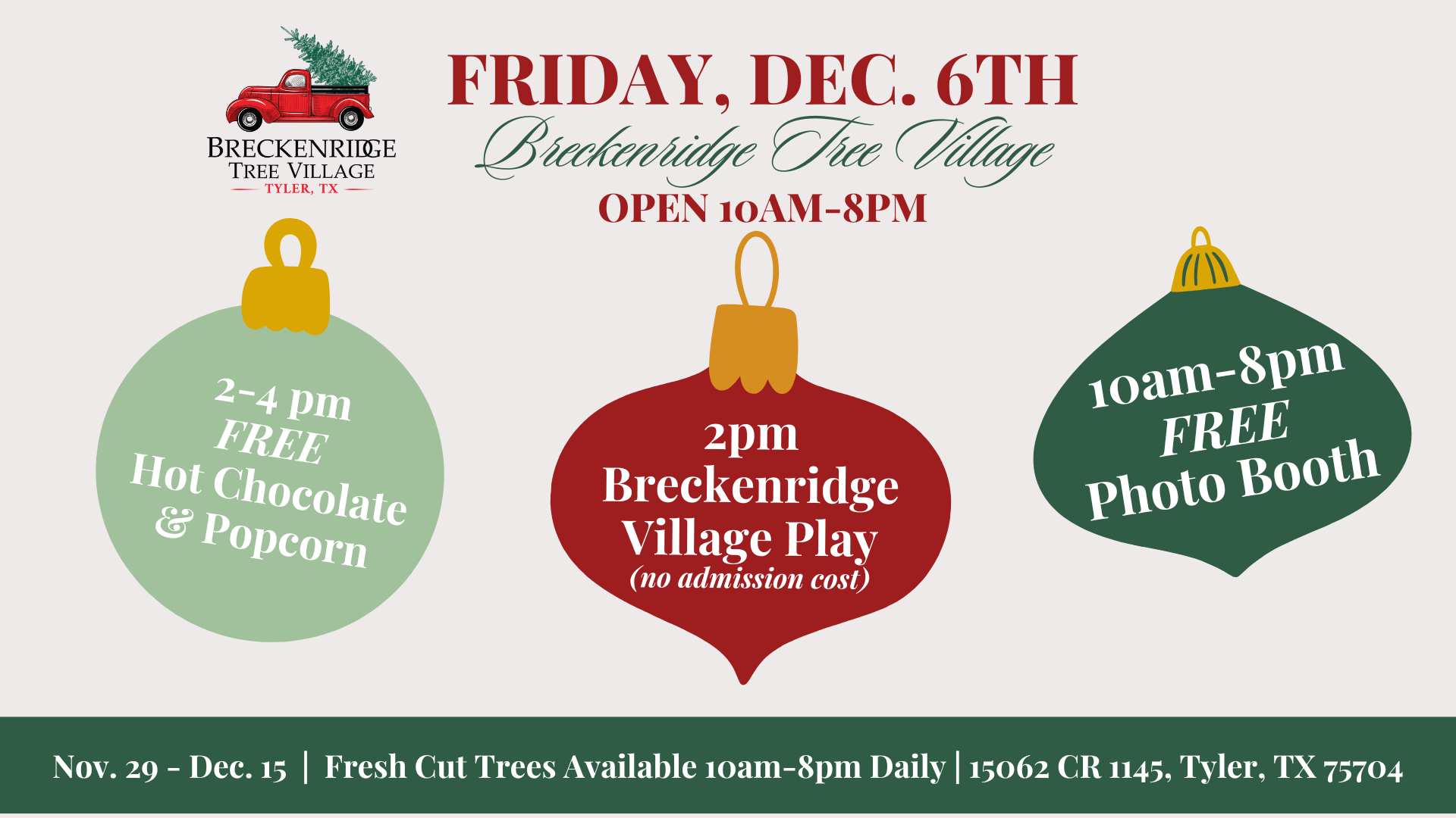 Make memories that last a lifetime. Join us at Breckenridge Village to purchase a fresh Christmas tree while enjoying festive fun for the whole family!