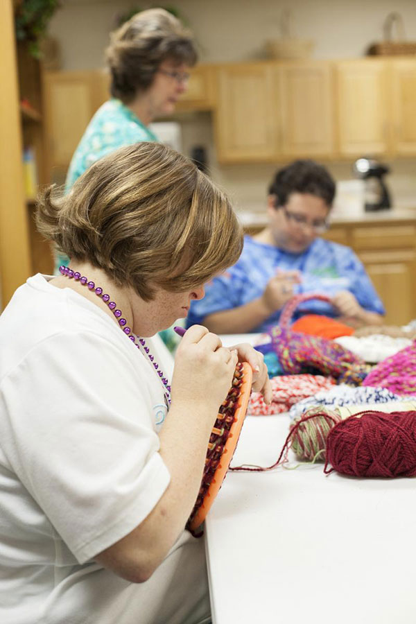 When she first found the Knifty Knitter looms, Diane thought, “Maybe the residents could learn how to make hats with these!” In the first year of knitting, Diane’s group created 200 hats. The number has grown every year since, reaching 370 hats in 2015. All of the hats are sent overseas and distributed to orphanages in Moldova in Eastern Europe every December by Children’s Emergency Relief International (CERI), the international branch of BCFS. Remarkably, BVT has not had to purchase yarn for any of the 2,400 hats they’ve created since the knitting group began. According to Diane, volunteers collect trunk loads of yarn donations from their churches. Arts and crafts have always been a part of BVT’s day habilitation program, but it was important to Diane that the residents “use their time and talents to serve others, and feel the joy that brings.”