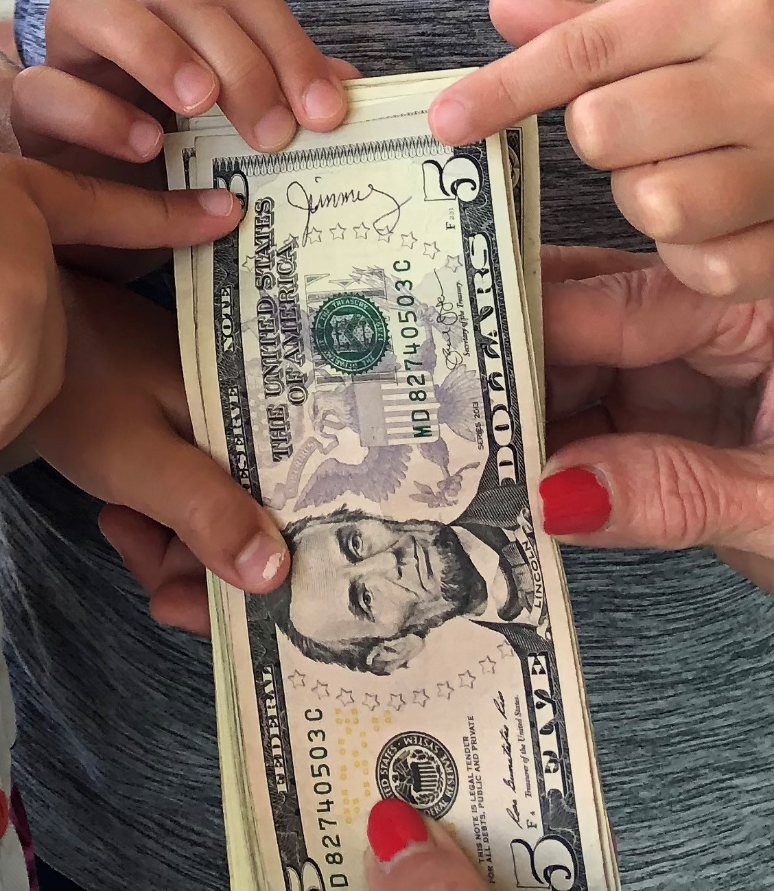 She then points to the top bill of the stack… the name “Jimmy” clearly written.